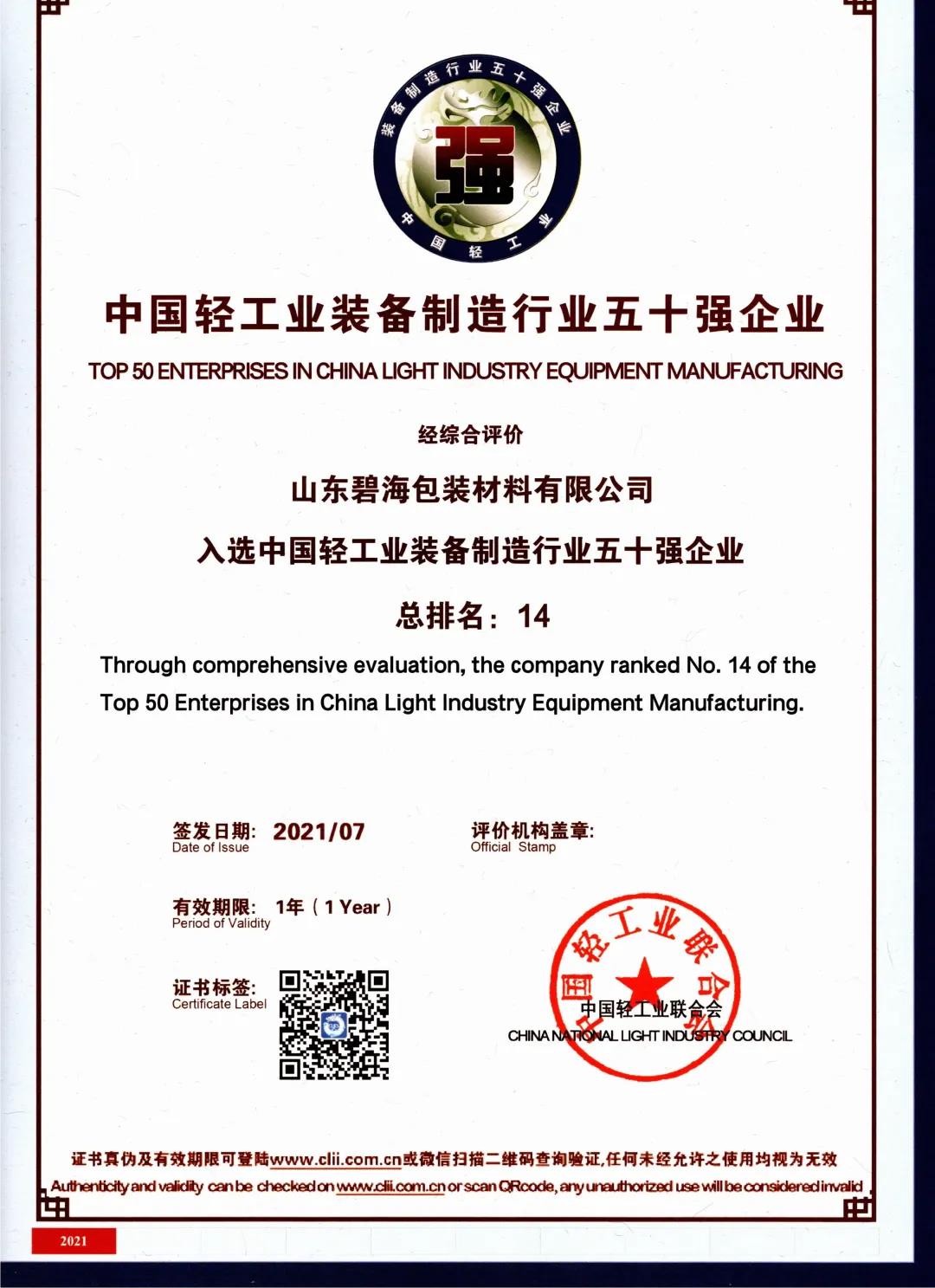 2021年7月20日,在北京召開(kāi)的“奮進(jìn)‘十四五’領(lǐng)航新消費”中國輕工業(yè)百強企業(yè)高峰論壇上,碧海公司入選中國輕工業(yè)裝備制造行業(yè)五十強企業(yè)(排名14)、中國液態(tài)食品機械行業(yè)十強企業(yè)(排名4),這是對我公司綜合實(shí)力、創(chuàng )新成就的高度肯定和認可。