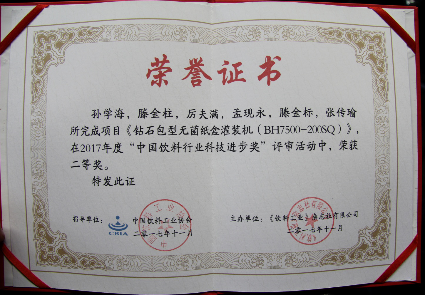 2017年11月21-24日,中國飲料工業(yè)協(xié)會(huì )年會(huì )、第八屆中國國際飲料工業(yè)科技展、“2017中國飲料行業(yè)科技創(chuàng )新論文獎與科技進(jìn)步獎”頒獎活動(dòng)在上海新國際博覽中心同期舉行,經(jīng)中國飲料工業(yè)協(xié)會(huì )評定,我公司的《鉆石包型無(wú)菌紙盒灌裝機(BH7500-200SQ)》項目榮獲“中國飲料行業(yè)科技進(jìn)步獎”二等獎。