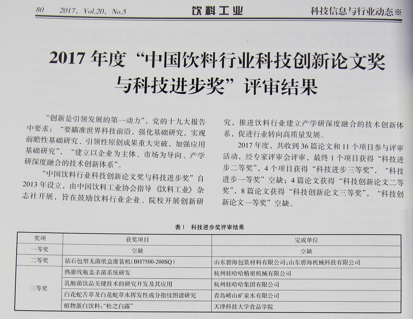 中國飲料工業(yè)協(xié)會(huì )設立的“中國飲料行業(yè)科技創(chuàng )新論文獎與科技進(jìn)步獎”旨在鼓勵飲料產(chǎn)業(yè)鏈科技工作者積極開(kāi)展科技創(chuàng )新和交流活動(dòng),加快行業(yè)科技進(jìn)步和發(fā)展;同時(shí),該獎項也將作為協(xié)會(huì )推薦國家其他獎項的重要依據與參考。